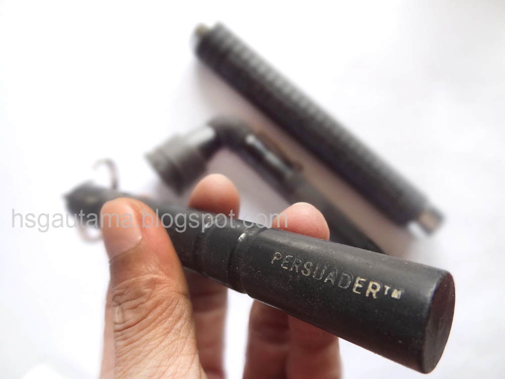 Namanya alat itu banyak, salah satunya disebut "persuader", dan yang kelihatan difoto dibawah ini adalah alat yang saya punya ketika dijaman SMP (tahun 1980), serius lho ya ini, alat difoto itulah yang saya pakai sejak jaman SMP digantungan celana, sudah lama saya simpan dirumah. Persuader adalah sebatang kayu keras solid yang dijadikan gantungan kunci, dia fungsinya sebagai alat pertahanan diri, mirip seperti baton stick polisi tapi dalam bentuk mininya. Gunanya sebagai alat impact point menghantam leher dan area wajah atau uluhati lawan dengan memakai stik kayu itu.